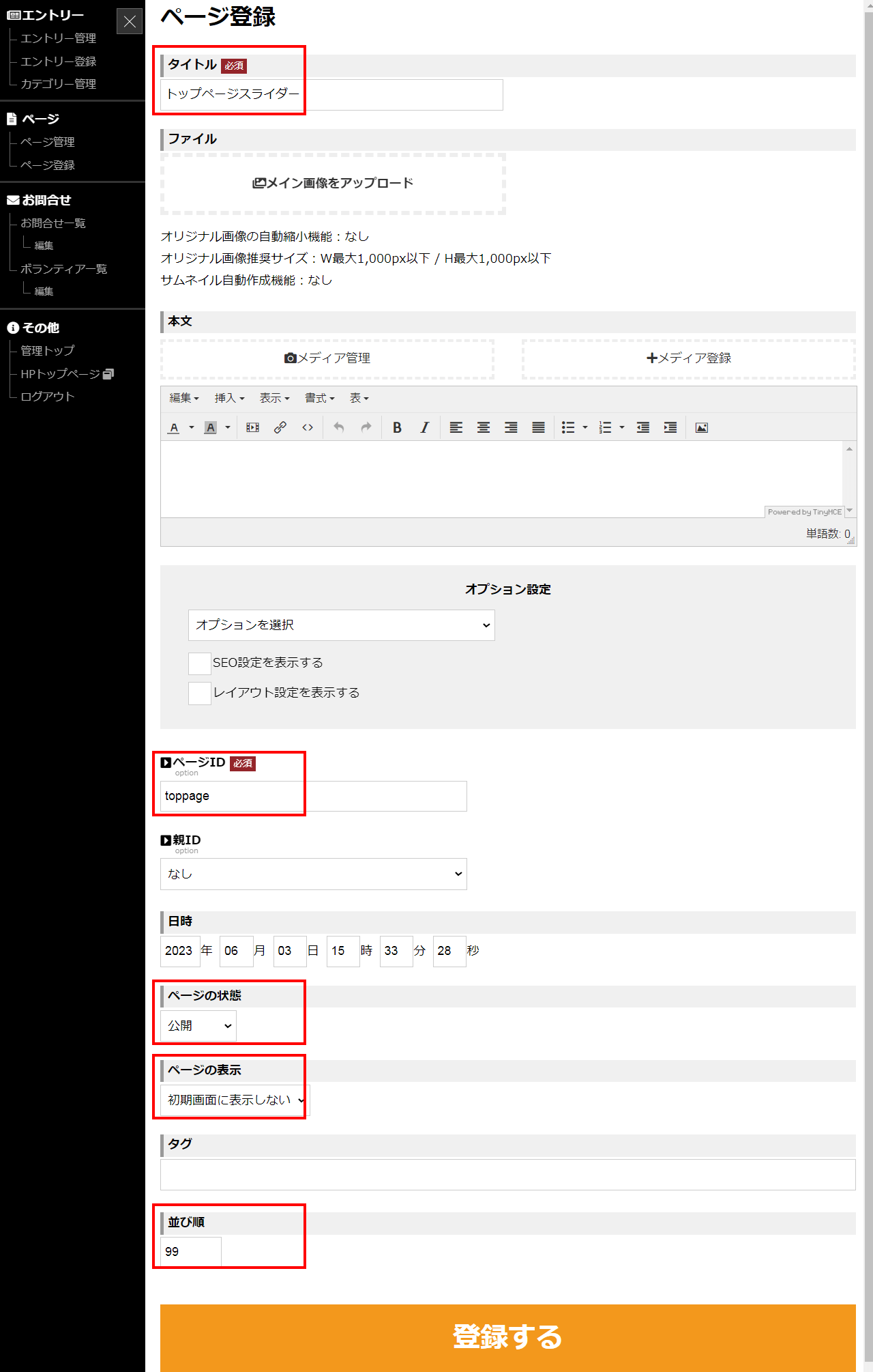 toppage_sliderURL01 スライダーURL01 ページ 一行入力 任意 空欄 空欄 任意の数字 なし
