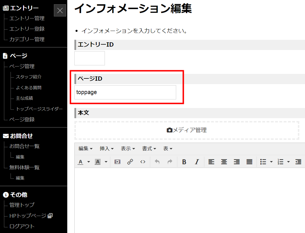 /admin/information_formにアクセスして、toppageを設定する。